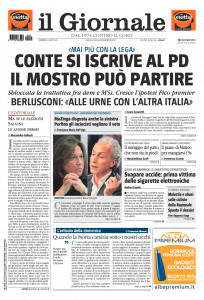 Premier, Grillo detta la linea. Ma Di Battista punta sulla Lega. In un post il fondatore lancia un Conte bis e il capo politico dice a Zingaretti: prendere o lasciare. (Corriere p.8). I due fronti nei 5 Stelle. Contro l’accordo sale la protesta sul web. Le tensioni nel Movimento. E i militanti tempestano il blog. (Corriere p.9). Il capo grillino tentato dalla Lega ma 150 parlamentari pronti al no. Di Maio prova a non chiudere il forno con Salvini, aperture anche di Di Battista. Grillo spinge per il Conte bis con i democrat. Ipotesi di mettere al voto l’intesa su Rousseau (Mesasggero p.5). Da Casaleggio a Di Battista i grillini filo-leghisti pronti a brindare. Paragone agente in sonno nel M5S, Buffagni e i buoni rapporti con via Bellerio: anche loro sperano di sabotare la mediazione coi dem. (Repubblica p.8). Dibba sogna il posto di Gigino per risorgere Il guerrigliero grillino torna a farsi sentire. Non chiude la porta al Carroccio e neanche alla sinistra. Sa che comunque vada per lui sarà un successo: se nasce un esecutivo qualsiasi è pronto a prendersi un ministero, se si va alle urne verrà eletto. (Libero p.5).