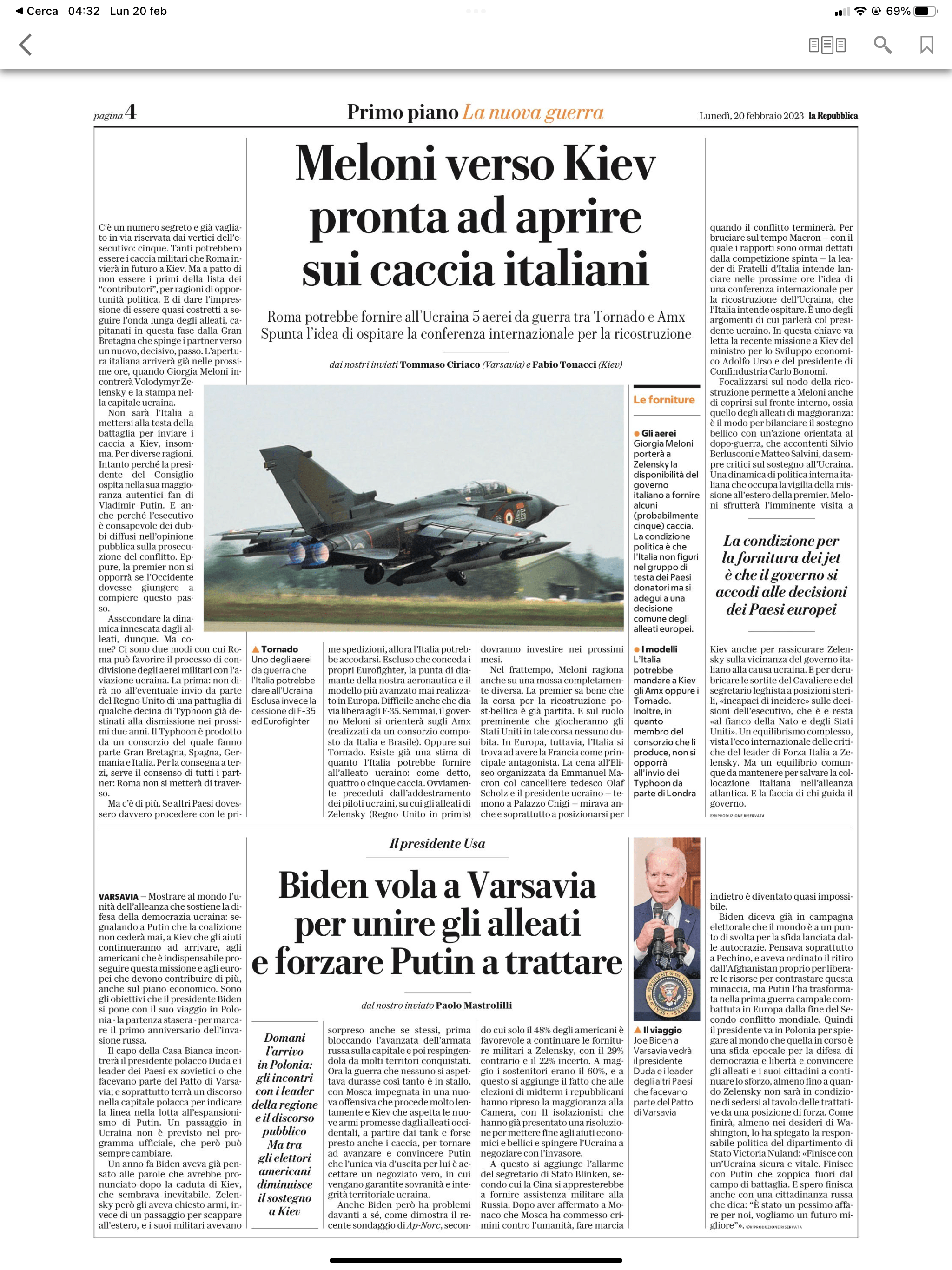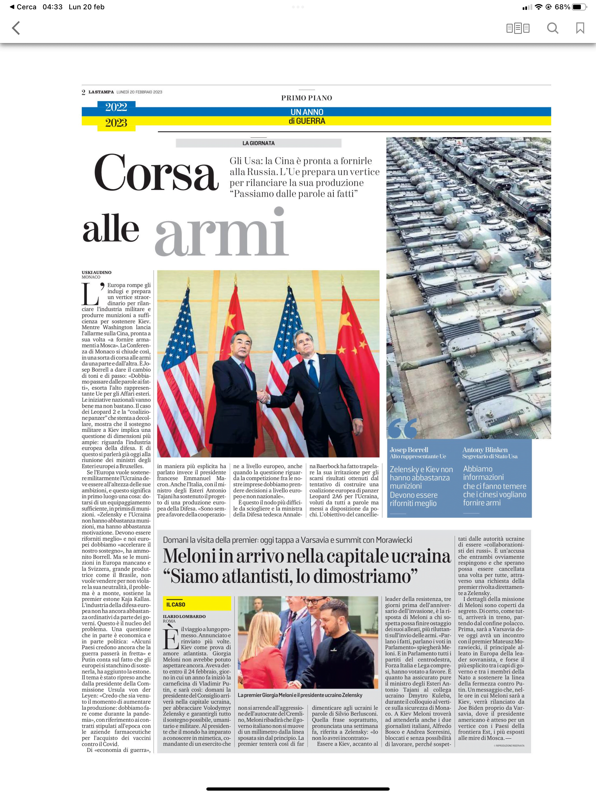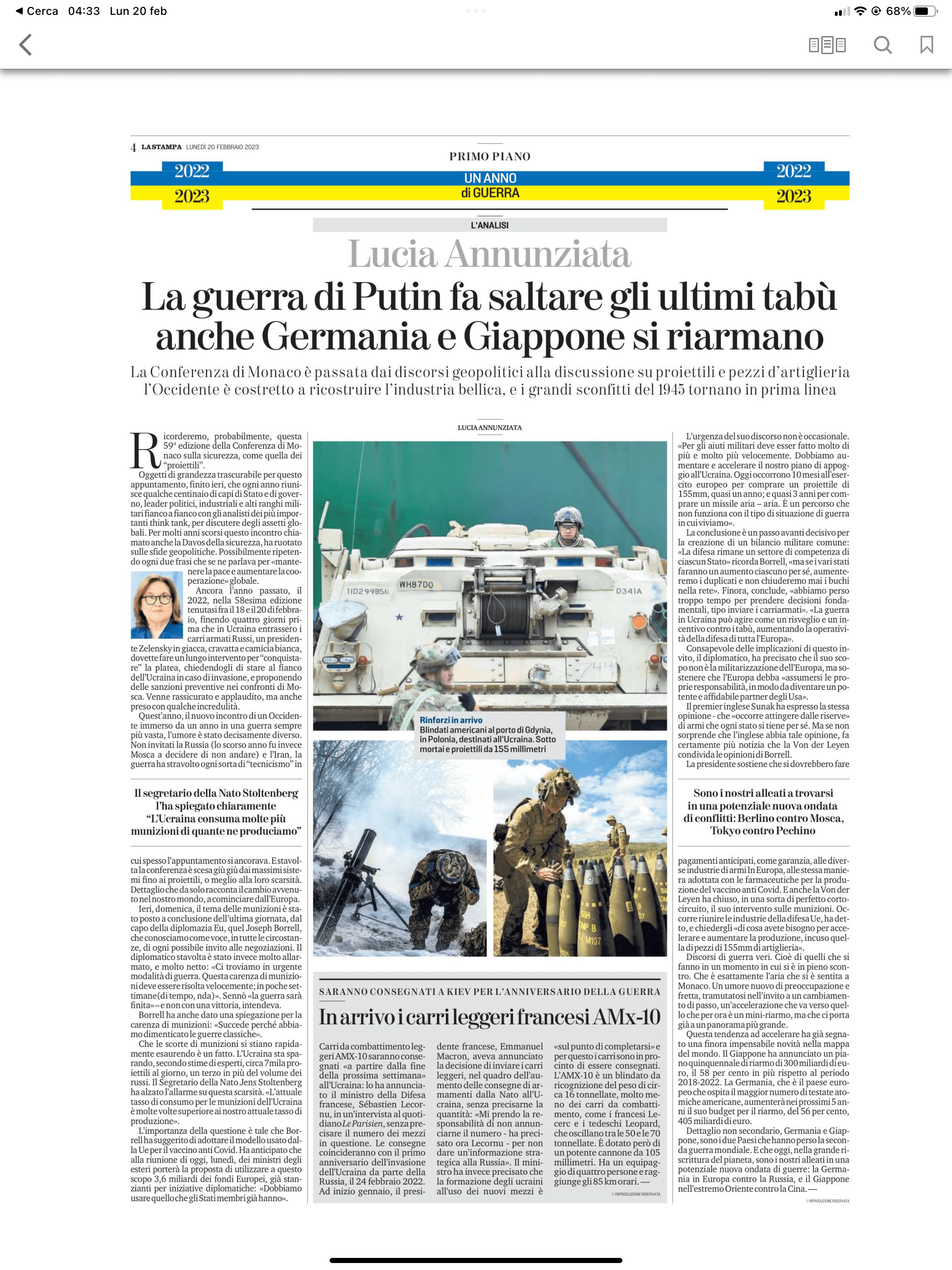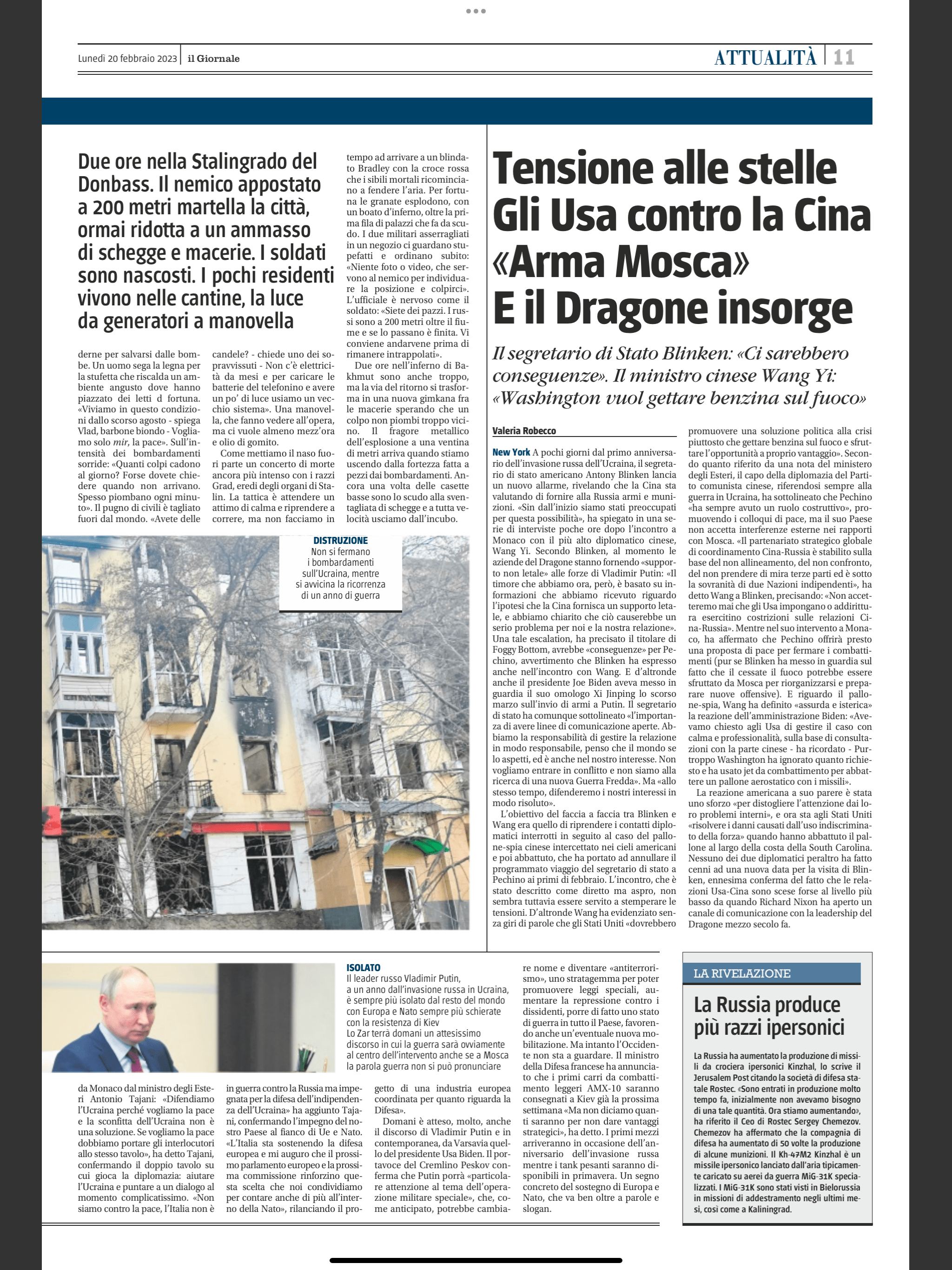 Ucraina. Il segretario generale della Nato Stoltenberg sostiene che una sconfitta nella regione di Donetsk non si tradurrebbe in una svolta nel conflitto anche se Mosca non va sottovalutata e si dice convinto, appunto, che Bakhmuth possa cadere nei prossimi giorni. Stoltenberg ha stimato che in questo anno di guerra gli alleati hanno garantito all’ucraina aiuti per 50 miliardi di euro di cui 65 di aiuti militari. La Nato dovrebbe approvare a breve le nuove linee guida della gestione delle scorte di munizioni fra i paesi membri. L’alleanza ha finora formato 11.000 soldati ucraini in particolare nell’uso di carri armati. La cifra salirà a 30.000 entro la fine dell’anno.