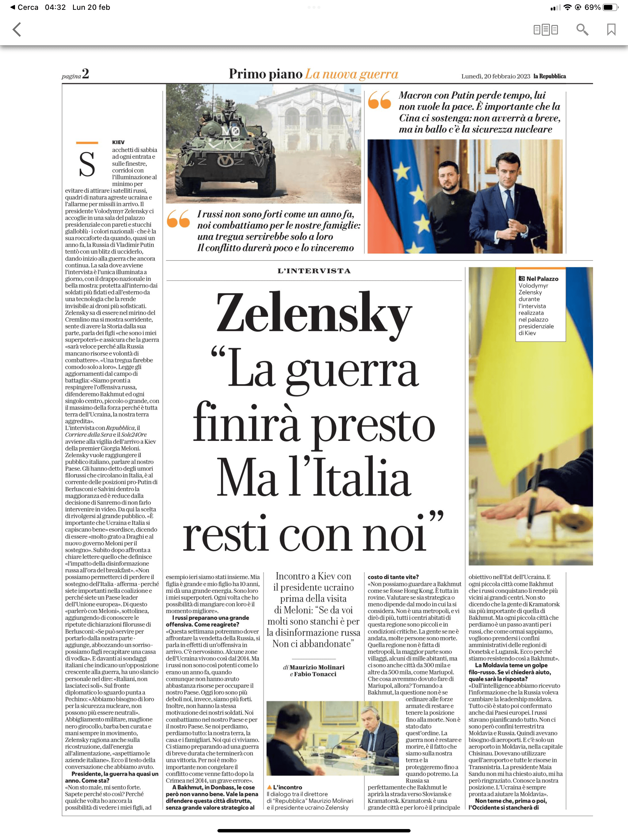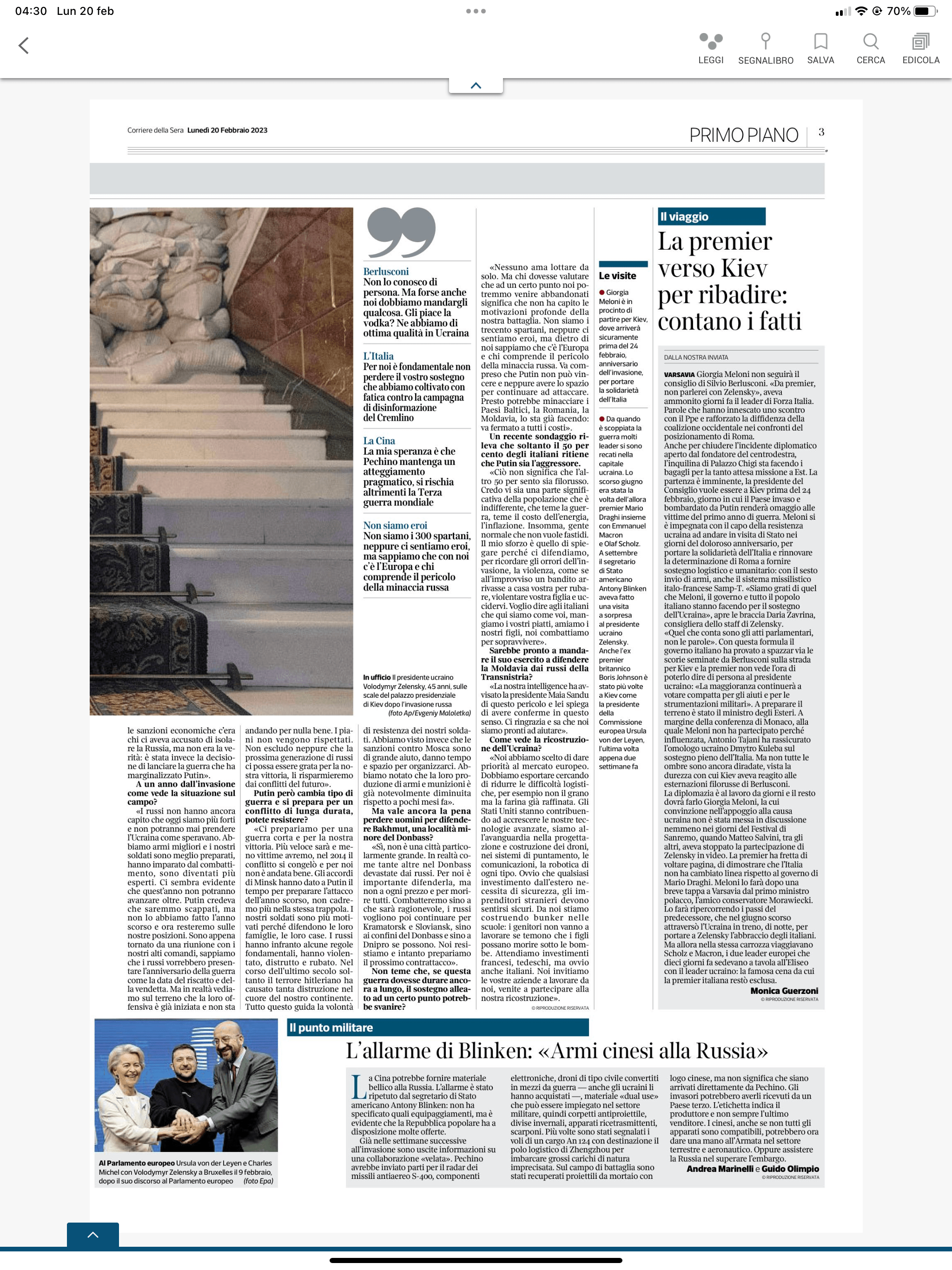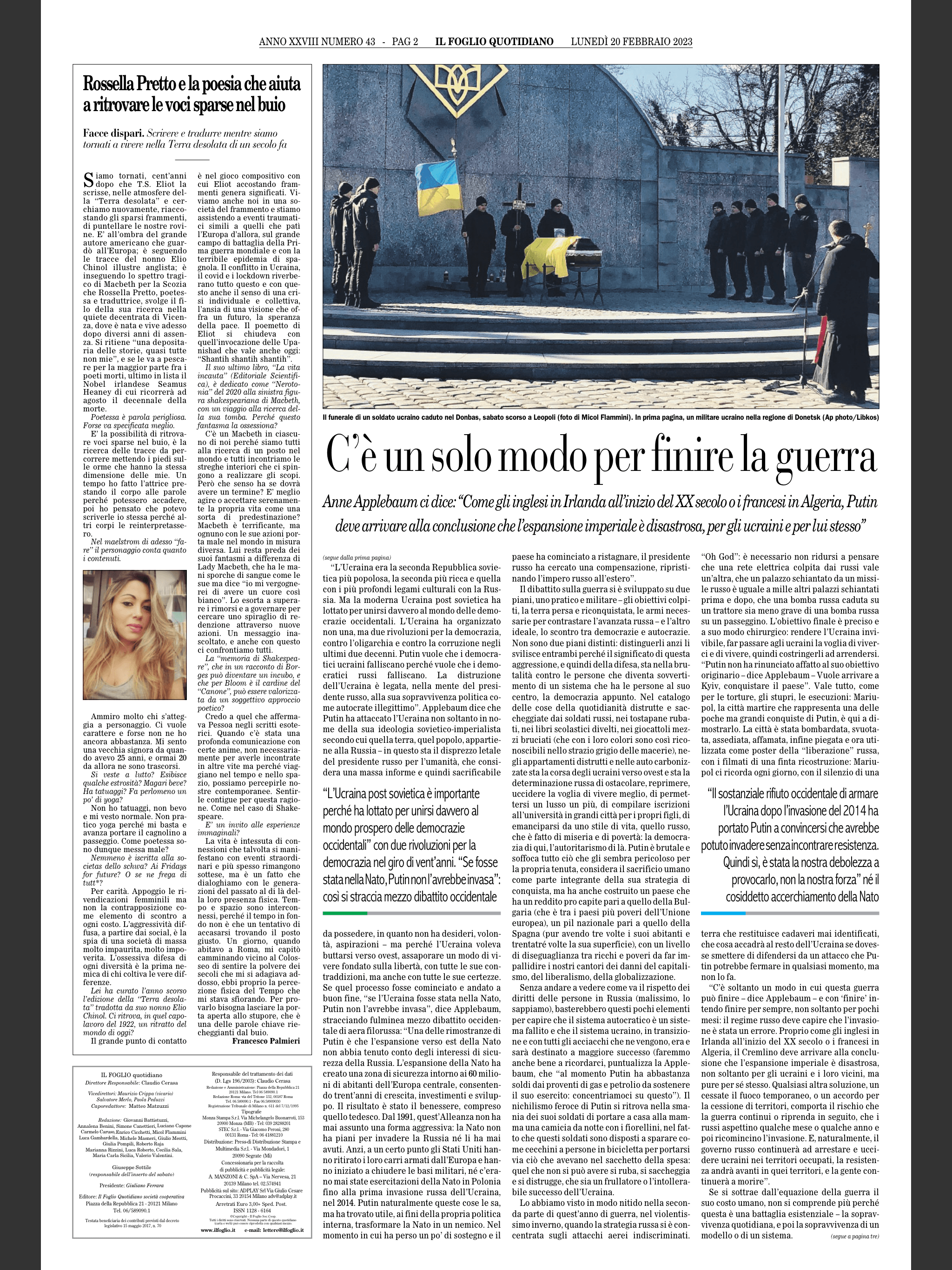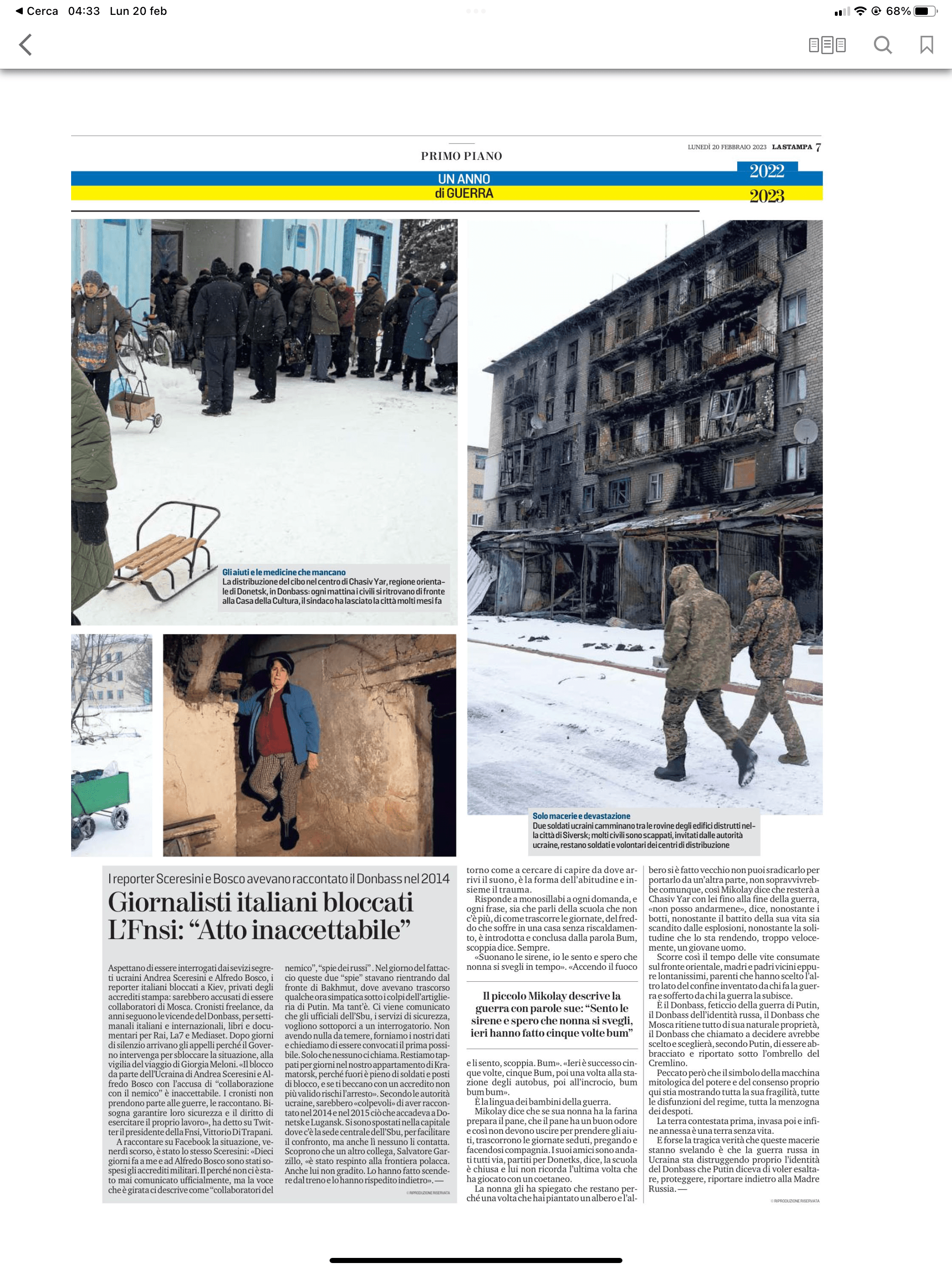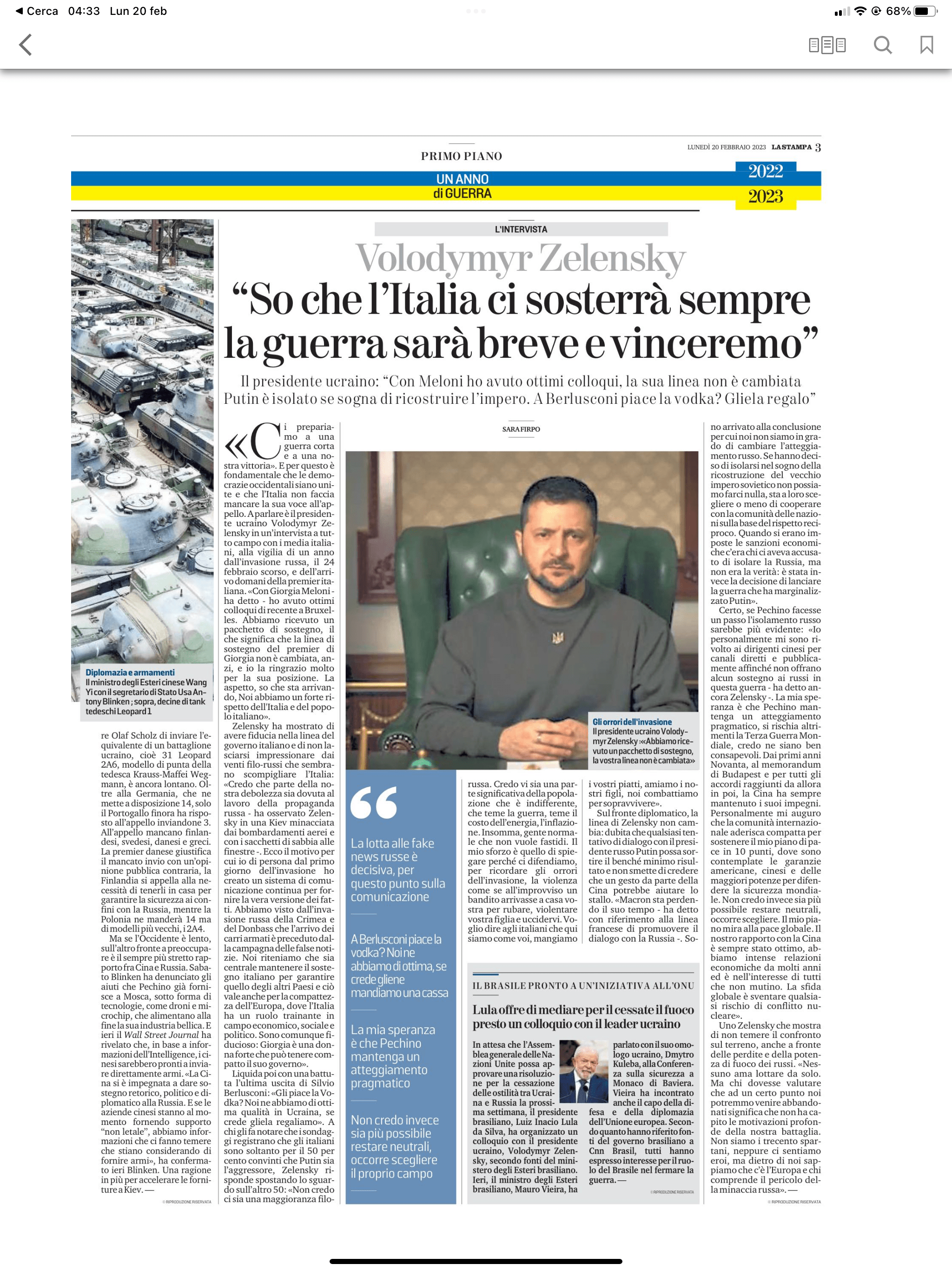 Ucraina. Il segretario generale della Nato Stoltenberg sostiene che una sconfitta nella regione di Donetsk non si tradurrebbe in una svolta nel conflitto anche se Mosca non va sottovalutata e si dice convinto, appunto, che Bakhmuth possa cadere nei prossimi giorni. Stoltenberg ha stimato che in questo anno di guerra gli alleati hanno garantito all’ucraina aiuti per 50 miliardi di euro di cui 65 di aiuti militari. La Nato dovrebbe approvare a breve le nuove linee guida della gestione delle scorte di munizioni fra i paesi membri. L’alleanza ha finora formato 11.000 soldati ucraini in particolare nell’uso di carri armati. La cifra salirà a 30.000 entro la fine dell’anno.