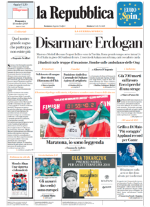 Buingiorno a tutti. La Turchia e la corsa a disarmare Erdogan, cioè chiudere la stalla quando i buoi sono già fuori: Di Feo su Repubblica, L’arsenale di Erdogan è già completo; la Jena sulla Stampa. La Germania blocca la vendita di armi alla Turchia, interviene Erdogan: “Tranquilli, quelle già vendute ci bastano e avanzano”. Il ministro degli interni che chiede riposte forti sui profughi. La festa dei Cinquestelle. Il record della maratona. Buona lettura a tutti.