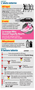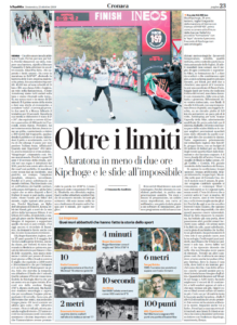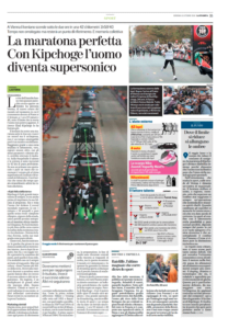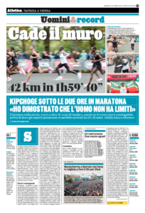 Maratona. Liberare i 42 chilometri da ogni brusco cambio di direzione, spazzolare l’asfalto fino a farlo diventare levigatissimo, scegliere data e ora più favorevoli, sostituire agli avversari 35 pace-maker che tagliano il vento e seguono ilritmo dettato da un raggio laser. Aggiungere scarpe bioniche (le fabbrica Nike) e selezionare l’atleta dalla corsa più economicaecon la motivazione più forte al mondo. Risultato: 1 ora 59’40”. Tanto ha impiegato ieri Eliud Kipchoge, keniano, 34 anni, primatista del mondo e doppio campione olimpico, a sbriciolare il muro delle due ore in maratona in un Prater di Vienna trasformato per lui in un privé del running dal mega sponsor inglese Ineos, quello del ciclismo, della vela, del calcio.