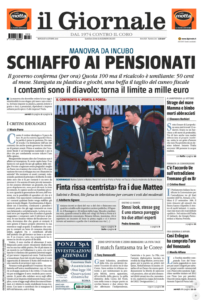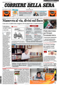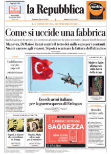 Buongiorno a tutti. I giornali di oggi aprono tutti con la manovra varata stanotte dal consiglio dei ministri. Tranne Repubblica che apre con la chiusura della Whirpool: Cosi si uccide una fabbrica. La guerra della Turchia, le armi italiane, la mamma e il bimbo abbracciati in fondo al mare di Lampedusa, la Catalogna, il duello Enzi Salvini da Vespa, un intervento di Papa Francesco sul Corriere, l’ultimo disco di Battiato e il suo male misterioso. Buona lettura a tutti.